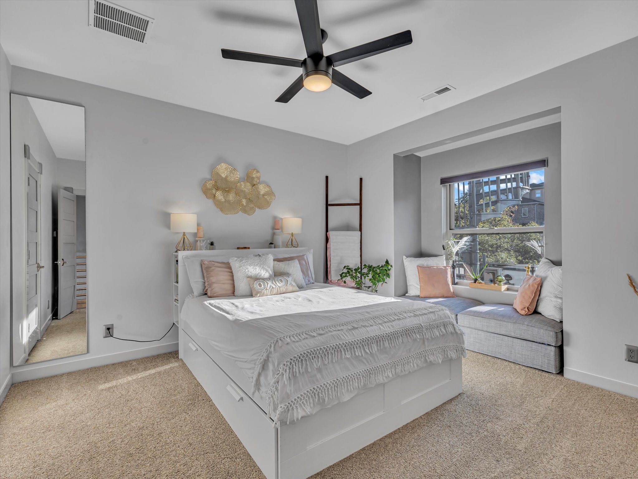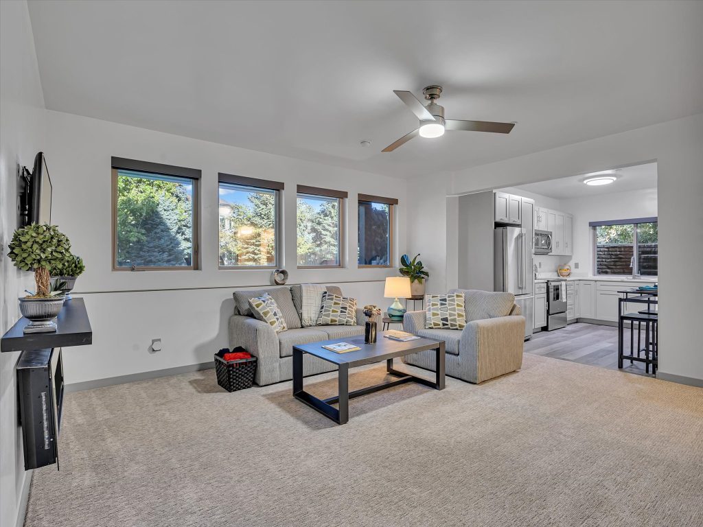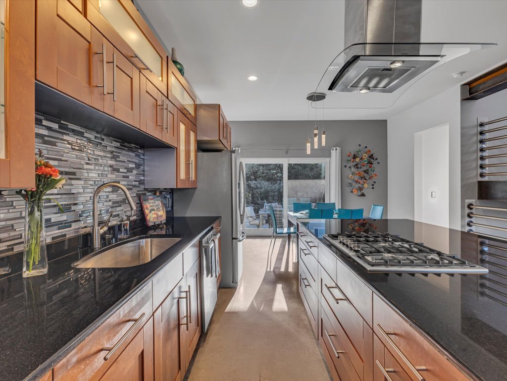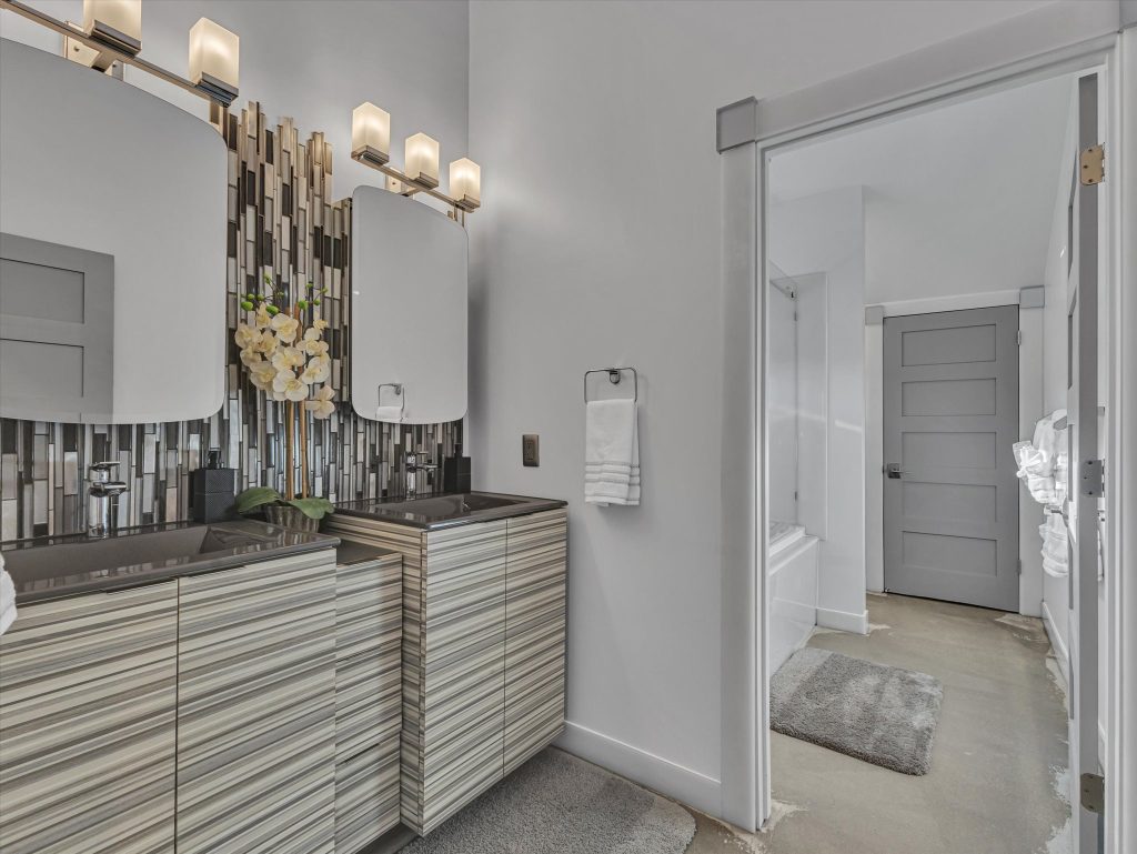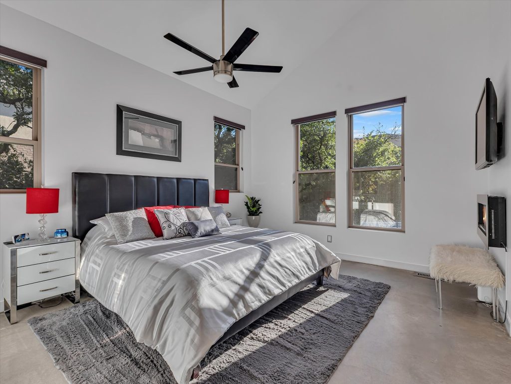 The family room and kitchen define open concept living, made for gatherings that start with dinner and spill out to fireside chats on the patio. The kitchen itself keeps pace with granite counters, a gas range, and cabinetry that looks as sharp hosting a Saturday night cocktail soiree as it does a weeknight family dinner. The primary suite is every bit a retreat, with 16-foot ceilings, two walk-in closets, and a spa bath featuring a separate jetted tub and shower. Upstairs, two more bedrooms and a full bath keep things flexible for family or friends.