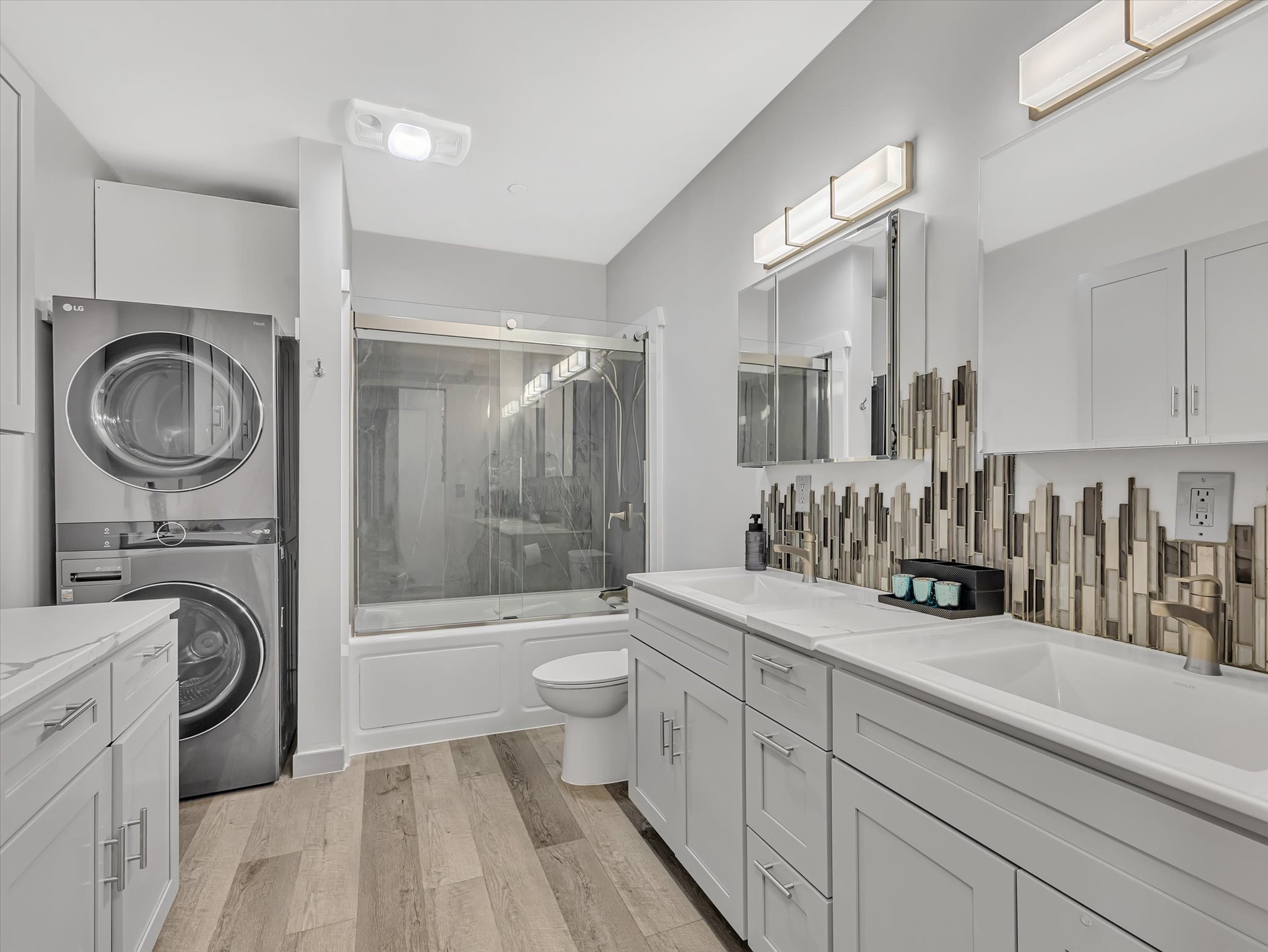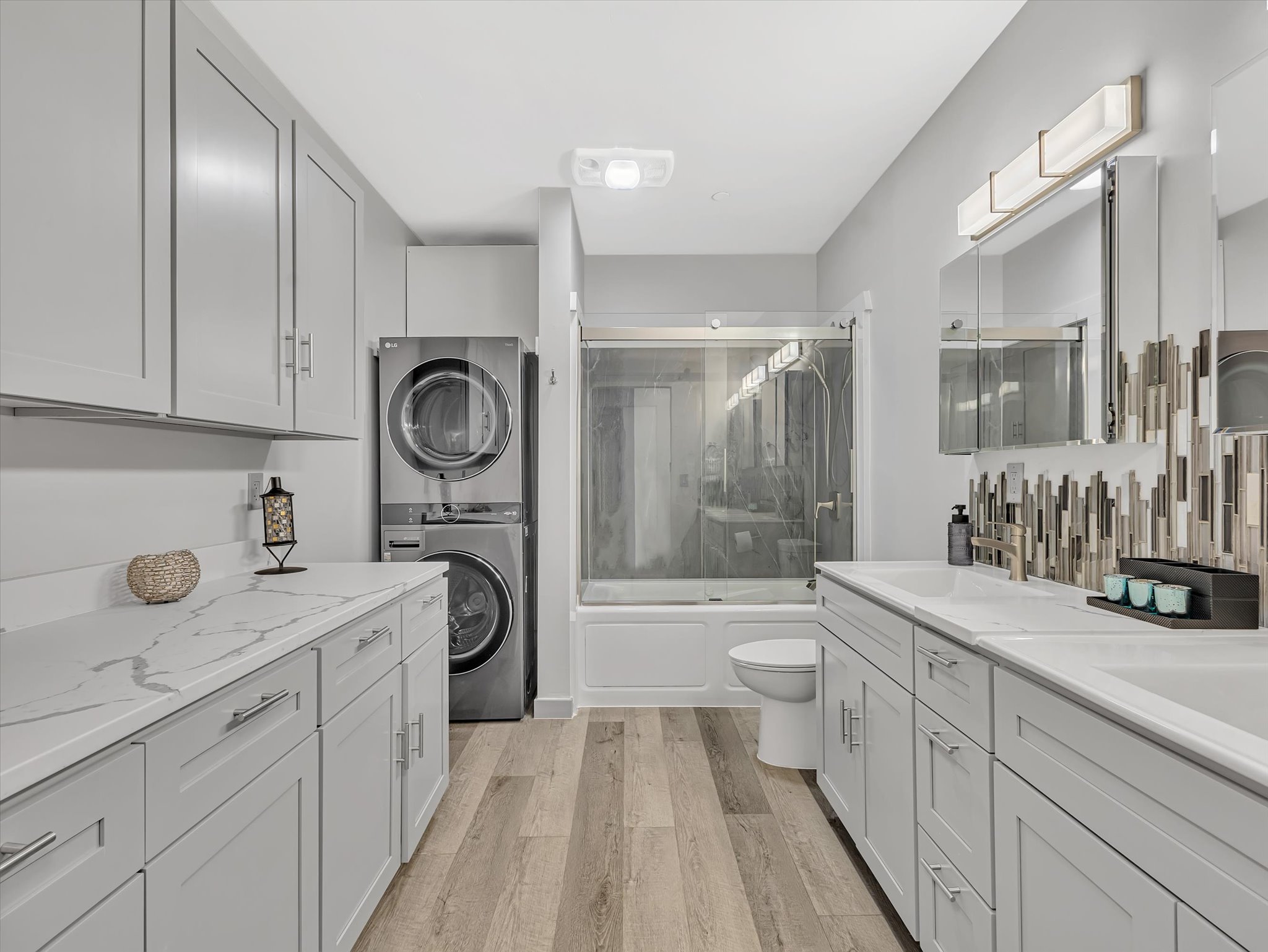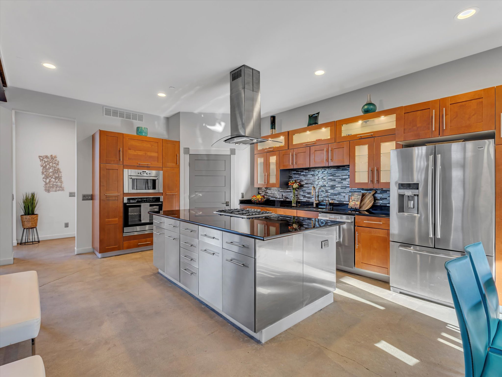 Downstairs, the ADU tells its own story. Two bedrooms, a bathroom, a full kitchen, and laundry give it everything it needs to stand on its own, with a private entry from the garage. Perfect for parents, kids, or guests who want their own space. And if you prefer it connected, a simple conversion brings it back into the main home. And then there is the garage. The short version? Room for six or more cars. Over 1,200 square feet of radiant-heated space, built-in storage, and an oversized bay tall enough for your RV or boat.